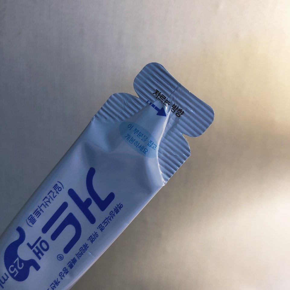 색상은 노란색이지만 아주 옅습니다. 점성이 있긴하지만 겔투나 겔포스처럼 요거트같은 느낌은 아니고 시럽을 삼키는 듯한 느낌입니다. 한 포에 25ml가 들어있습니다.